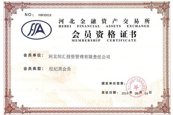 2014年8月,嘉聯(lián)集團(tuán)旗下河北恒匯投資管理有限責(zé)任公司獲得河北金融資產(chǎn)交易所頒發(fā)的《會(huì)員資格證書》,正式成為其經(jīng)紀(jì)類會(huì)員。