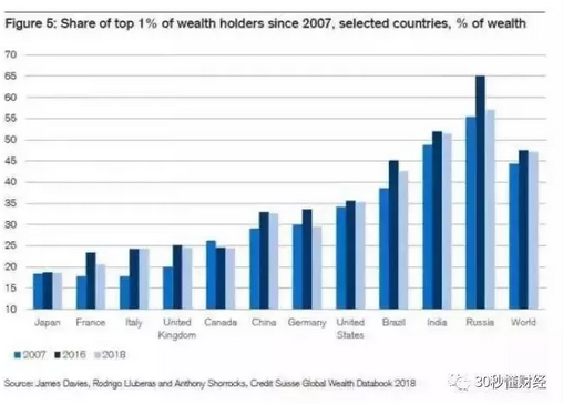 世界上每個成年人的資產(chǎn)增加了3.2%,并將全球人均資產(chǎn)提高到63100美元,創(chuàng)歷史新高。其中75%的增長率來自中國、歐洲以及印度的增長總和。中國家庭總財富已超過50萬億,緊跟美國之后,位居全球第二。但人均財富而言,瑞士人最富,個人平均財富達到53萬美元。與此同時,全球貧富差距形勢依然嚴峻,全世界一近半的財富握在1%的人手中。